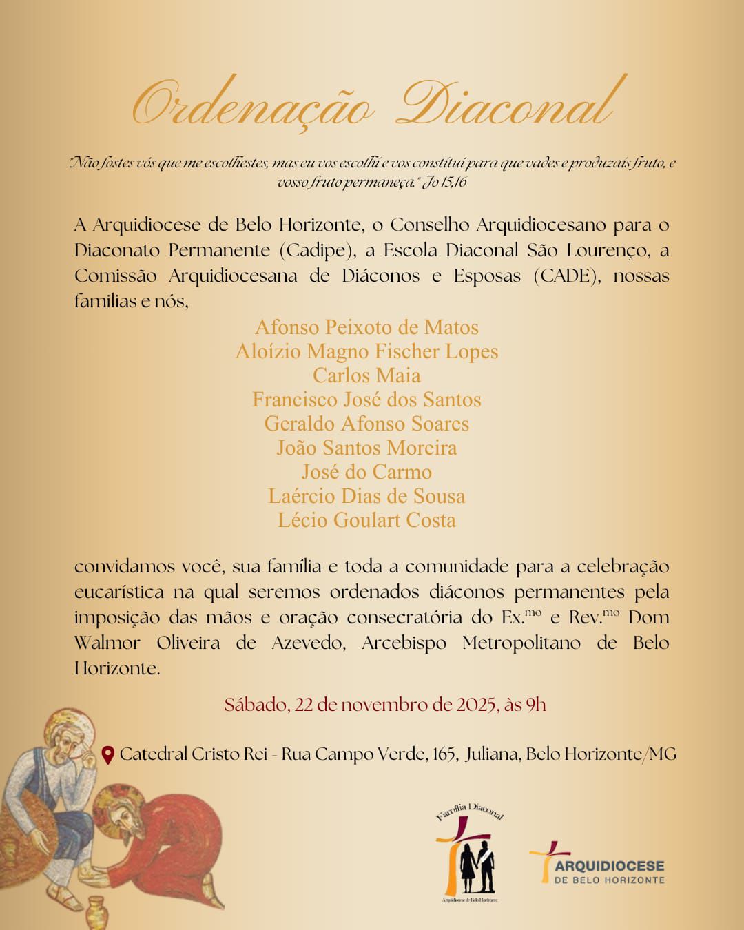 A Arquidiocese de Belo Horizonte, o Conselho Arquidiocesano para o Diaconato Permanente, a Escola Diaconal São Lourenço e a Comissão Arquidiocesana de Diáconos e Esposas (CADE) convidam fiéis e comunidades de fé para a Ordenação Diaconal.