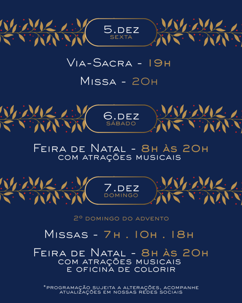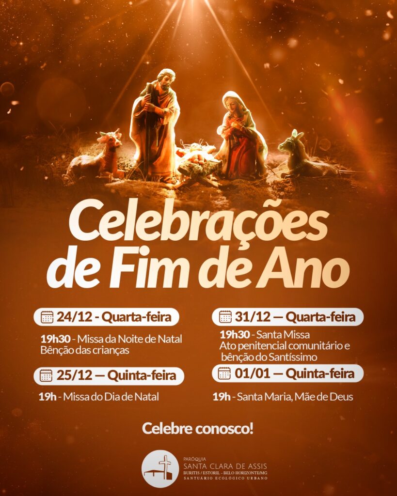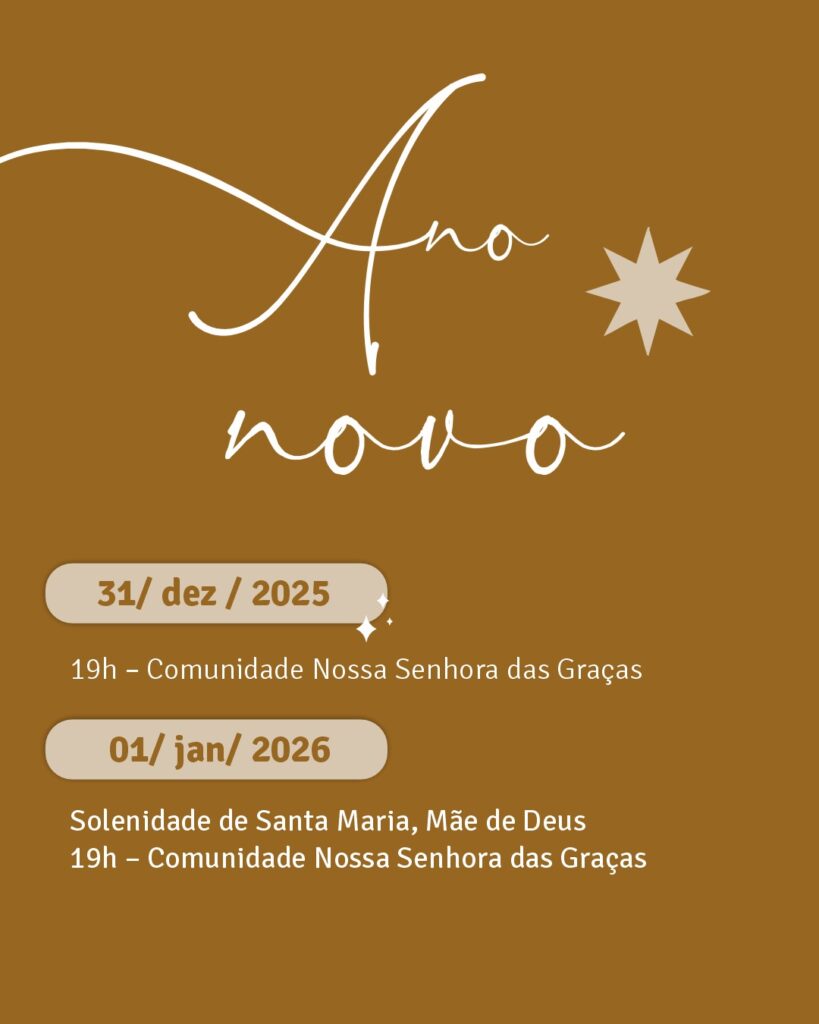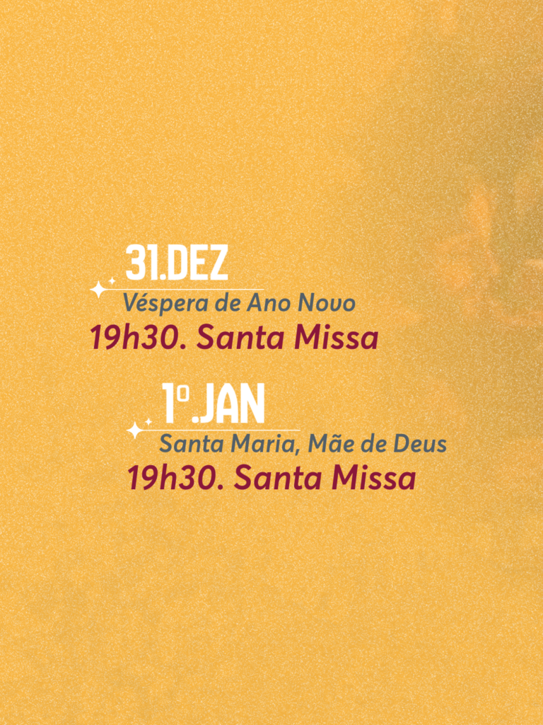 No dia 31 de dezembro, quarta-feira, a Missa de Véspera de Ano Novo será presidida às 19h30. Já no dia 1º de janeiro, a Celebração Eucarística de Santa Maria, Mãe de Deus, também será às 19h30. Acompanhe a programação, a seguir, e participe com sua família e amigos destes momentos especiais de comunhão e fé!🙏