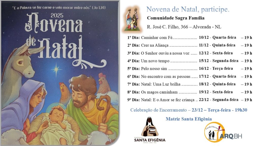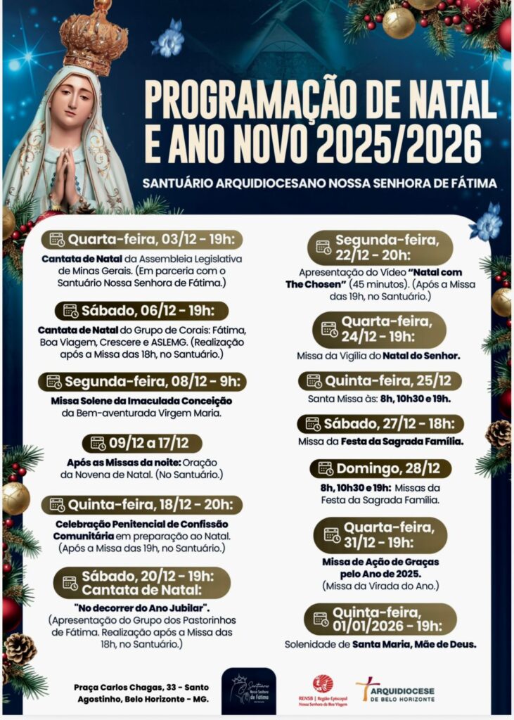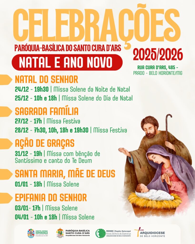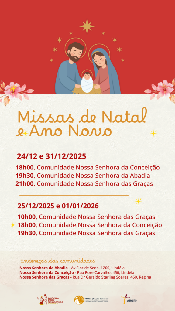 Inspiradas pelo Tempo do Natal e em preparação para o nascimento de Jesus, as comunidades de fé da Arquidiocese de Belo Horizonte convidam fiéis e suas famílias para programação especial de Natal e Ano Novo que contempla cantatas, apresentações artísticas, novenas e Santa Missa, reunindo espiritualidade, cultura e fé.