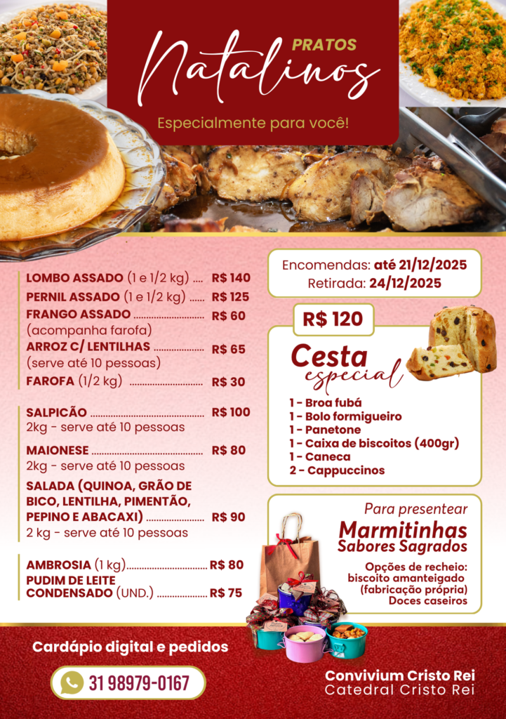 Ao adquirir a sua Ceia de Natal, você ajuda a edificar a Catedral Cristo Rei! As encomendas podem ser feitas até o dia 21 de dezembro e a retirada ocorre no dia 24. Faça a sua encomenda pelo nº (31) 98979-0167 (WhatsApp).