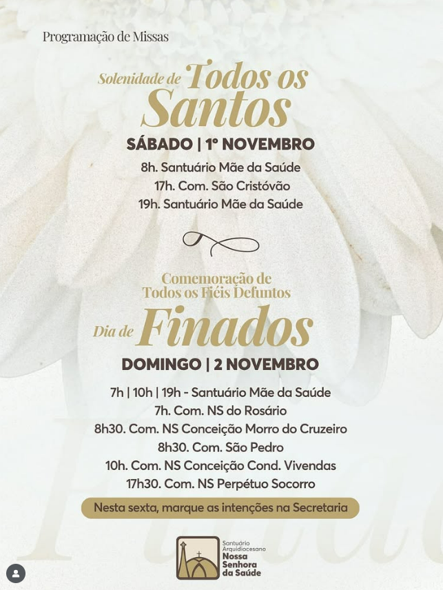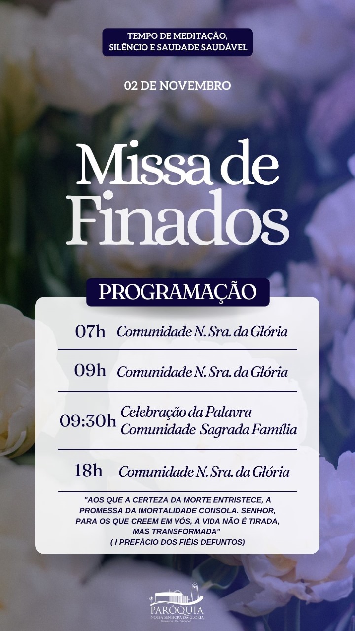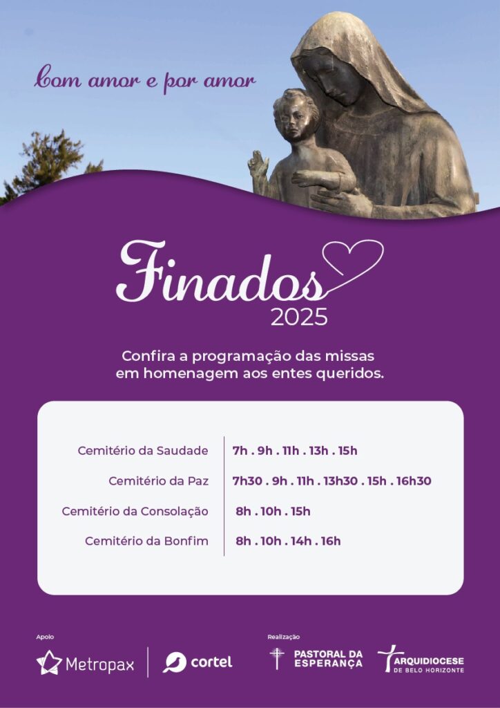 No Dia de Finados – domingo, 2 de novembro, as comunidades de fé da Arquidiocese de Belo Horizonte se reúnem para rezar por aqueles que já foram chamados pelo Pai. Missas, oração do Terço, Laudes e Vésperas serão celebradas durante todo o dia em homenagem aos entes queridos já falecidos. A programação será vivenciada em cemitérios, santuários e paróquias da Arquidiocese de Belo Horizonte. Na Catedral Cristo Rei – nossa Igreja-Mãe, a celebração de finados será às 8h, às 10h30 e às 15h30.