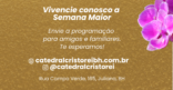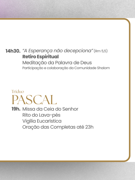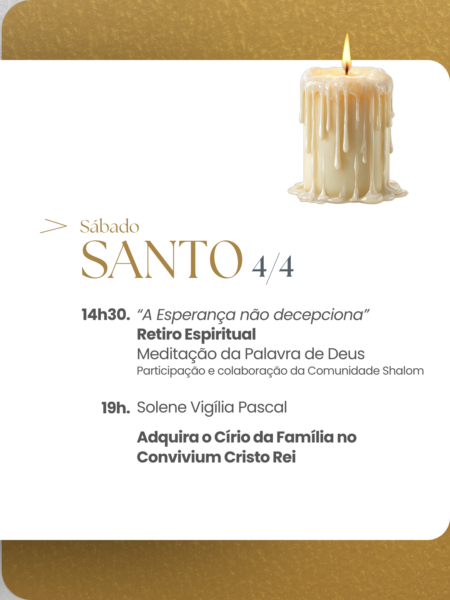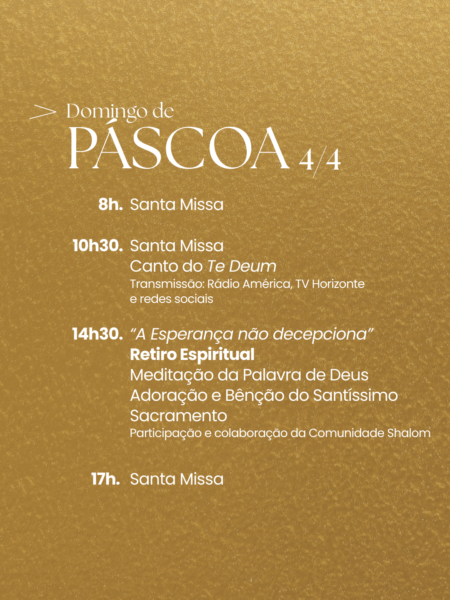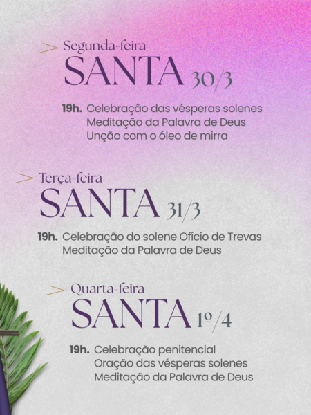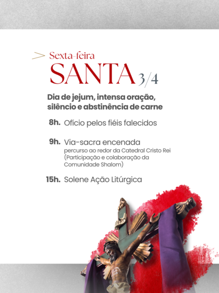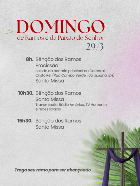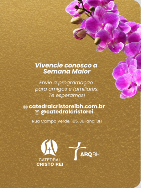 Maior retiro espiritual das comunidades de fé, a Semana Santa tem programação especial na Catedral Cristo Rei. As celebrações, cuidadosamente planejadas, vão inspirar o silêncio, a contemplação e a renovação da esperança na vitória da vida sobre a morte.